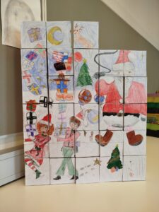 Vier Schülerinnen und ein Schüler, die mit ihren Portraits schon fertig waren, gestalteten diesen wunderschönen Adventkalender für die Klasse. Hoffentlich…