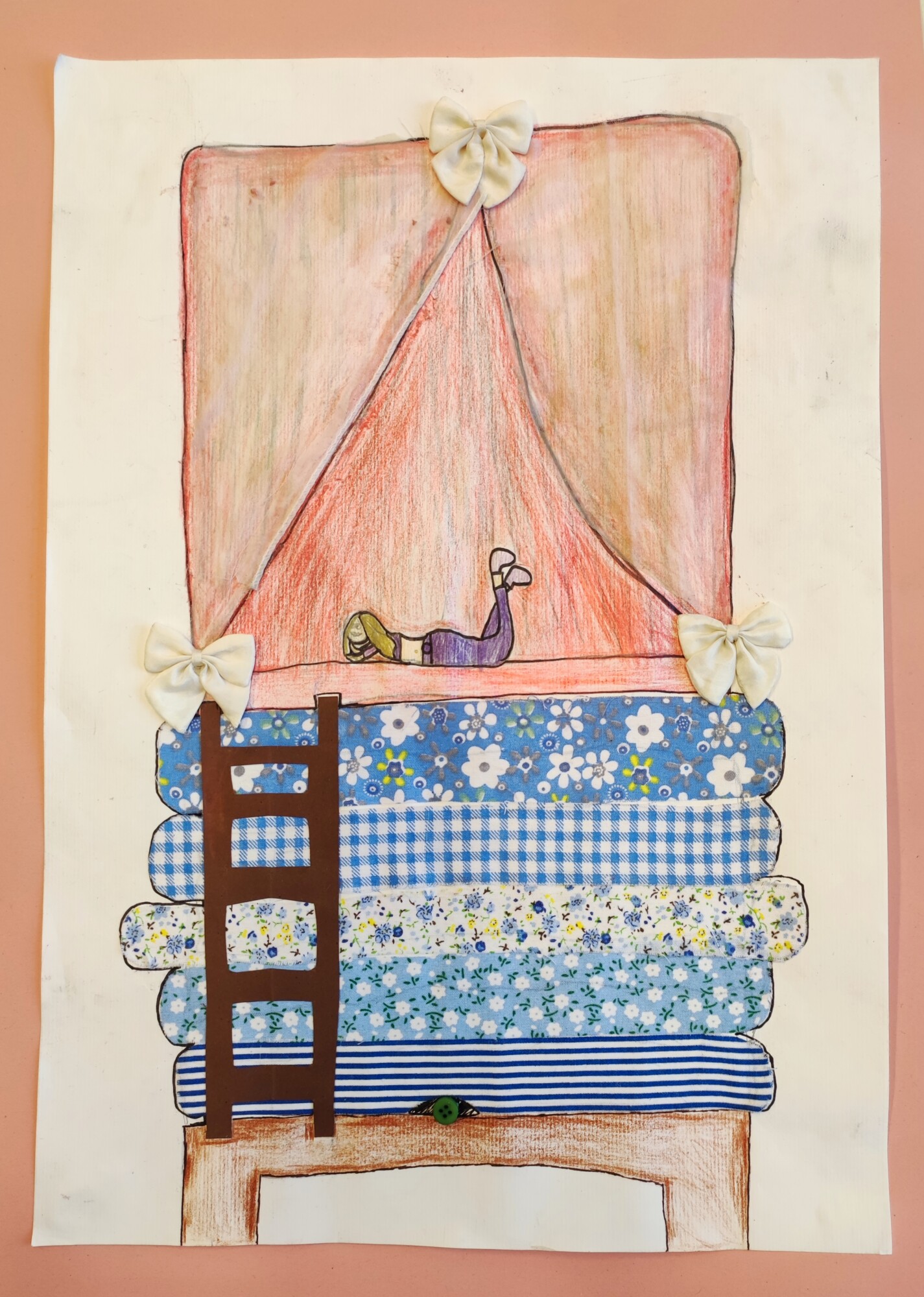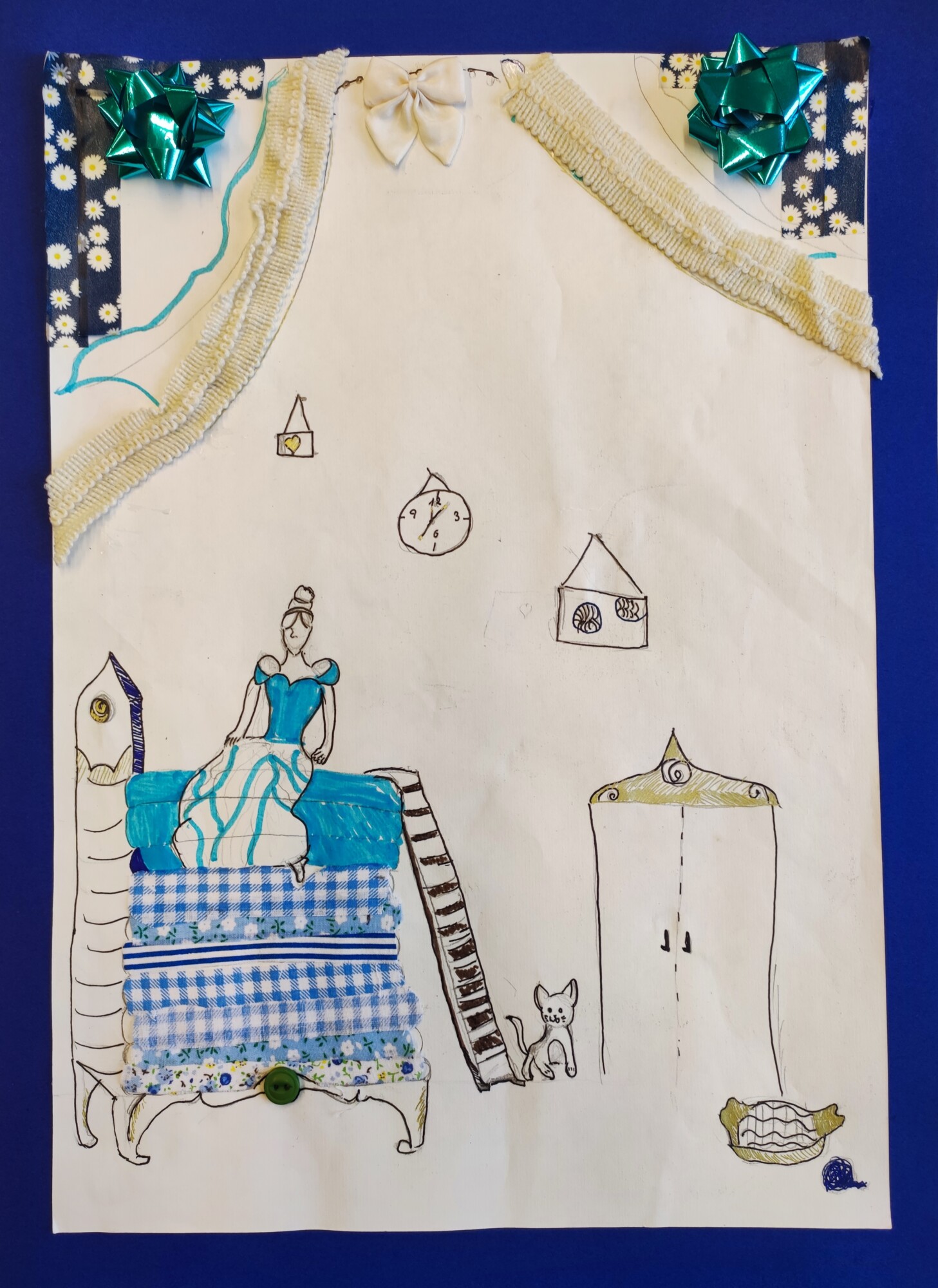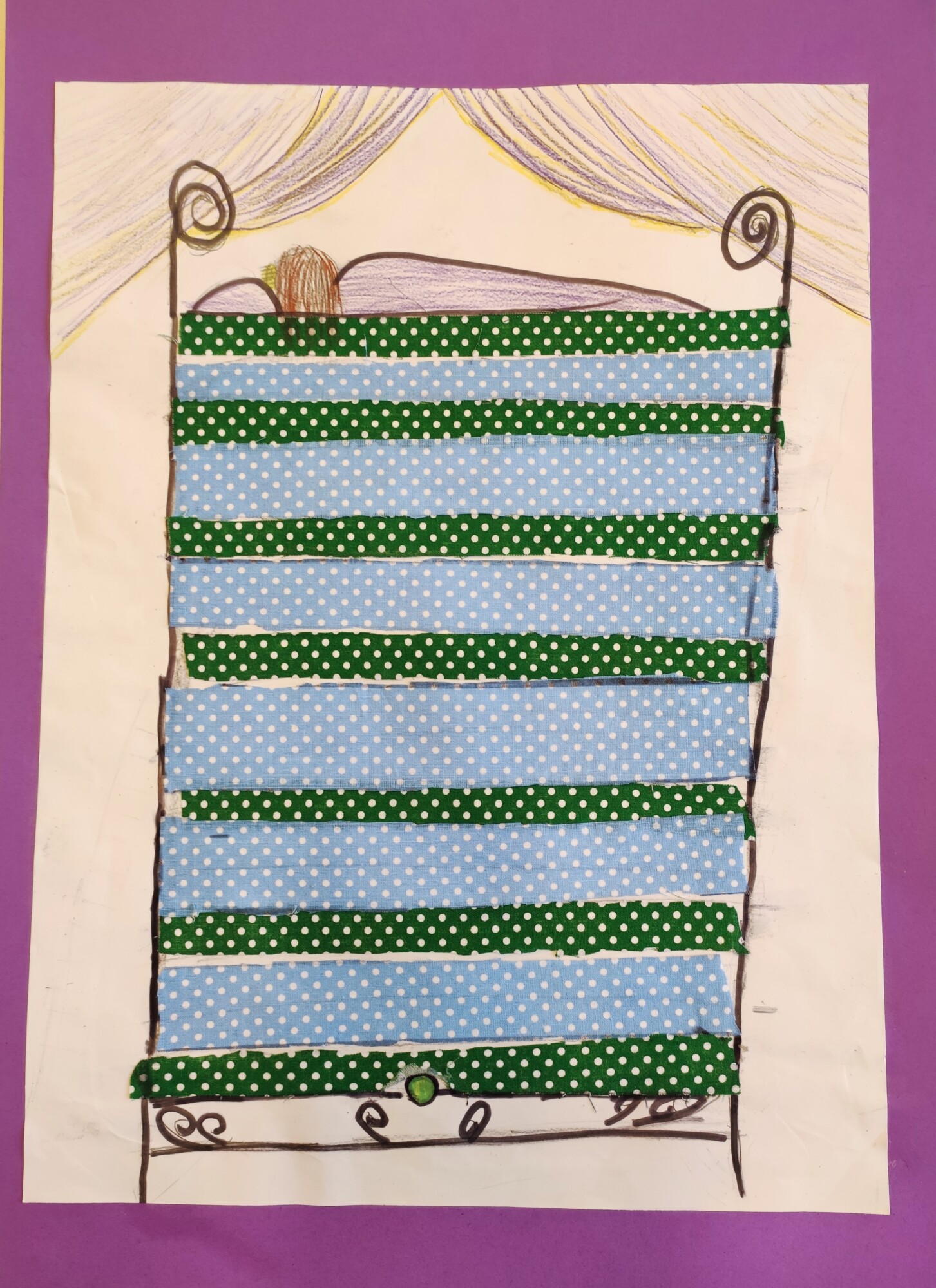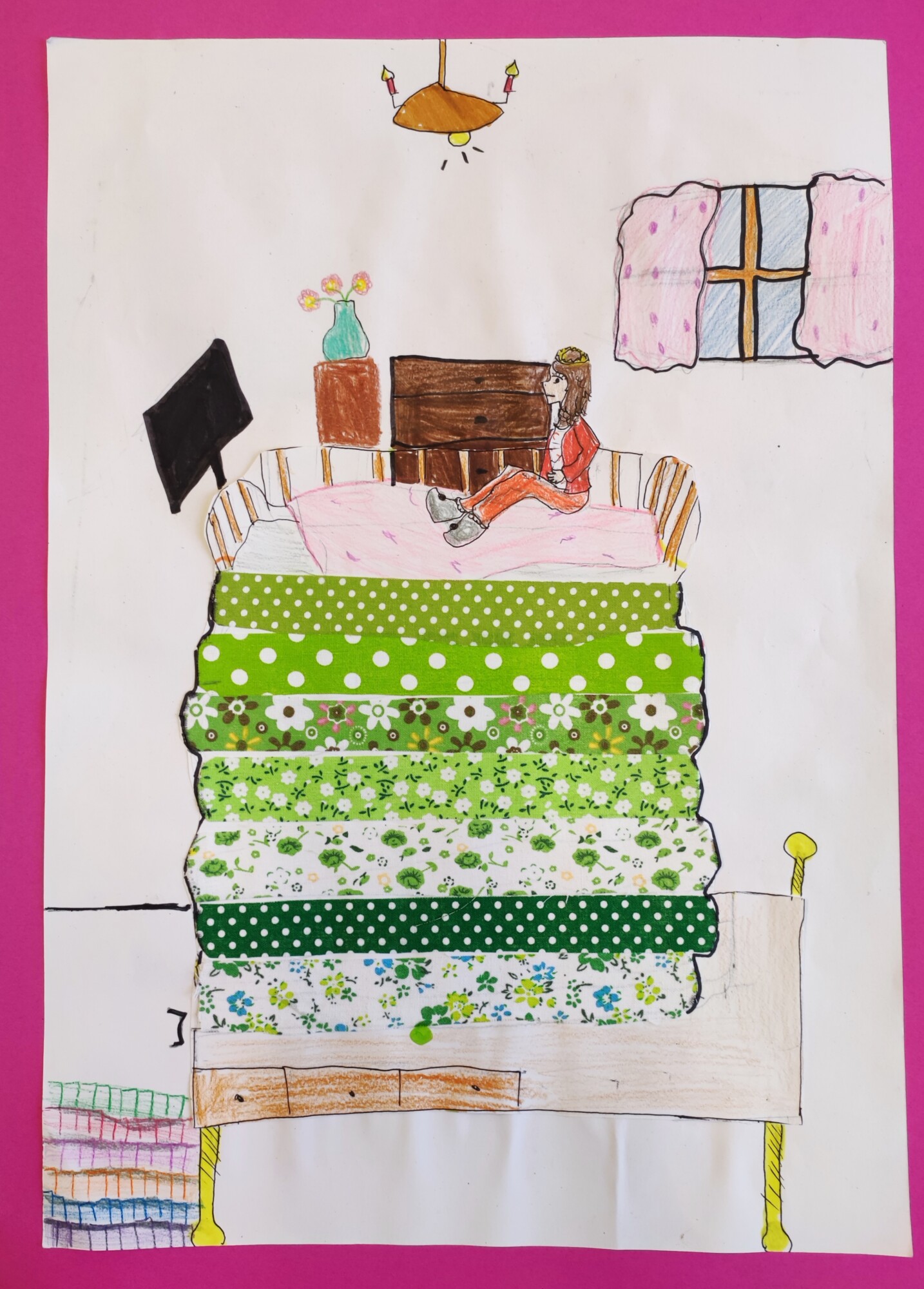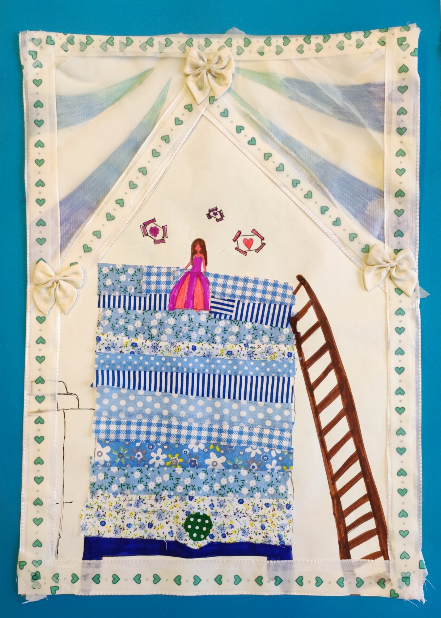 Nachdem die SchülerInnen das Märchen „Die Prinzessin auf der Erbse“ von Hans Christian Andersen gesehen und gehört hatten, gestalteten sie ein Mixed Media-Bild der „wehleidigen“ Prinzessin. Verwendet wurden Stoffe, Washi Tapes, Maschen, Geschenkbänder und vieles mehr.