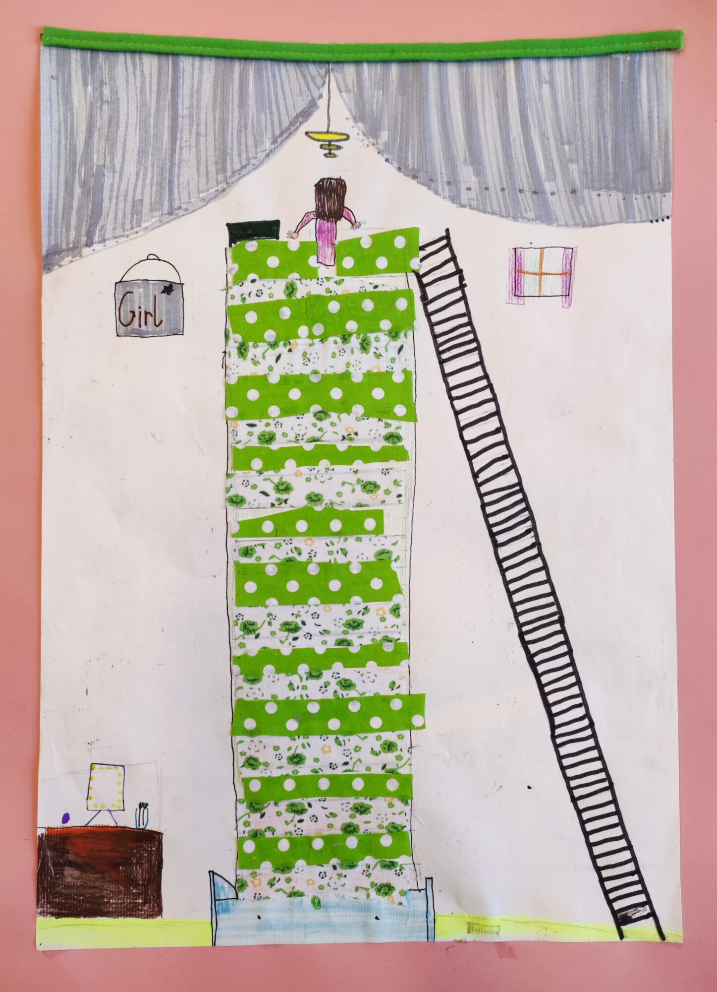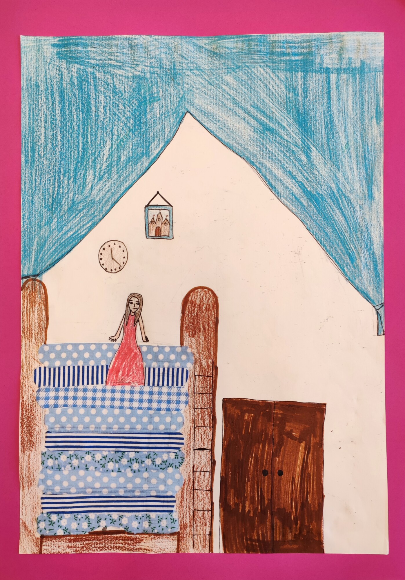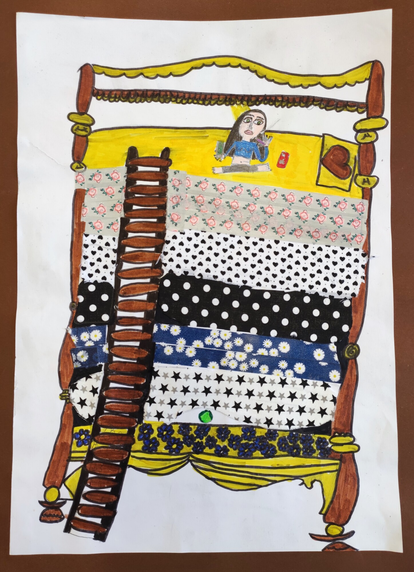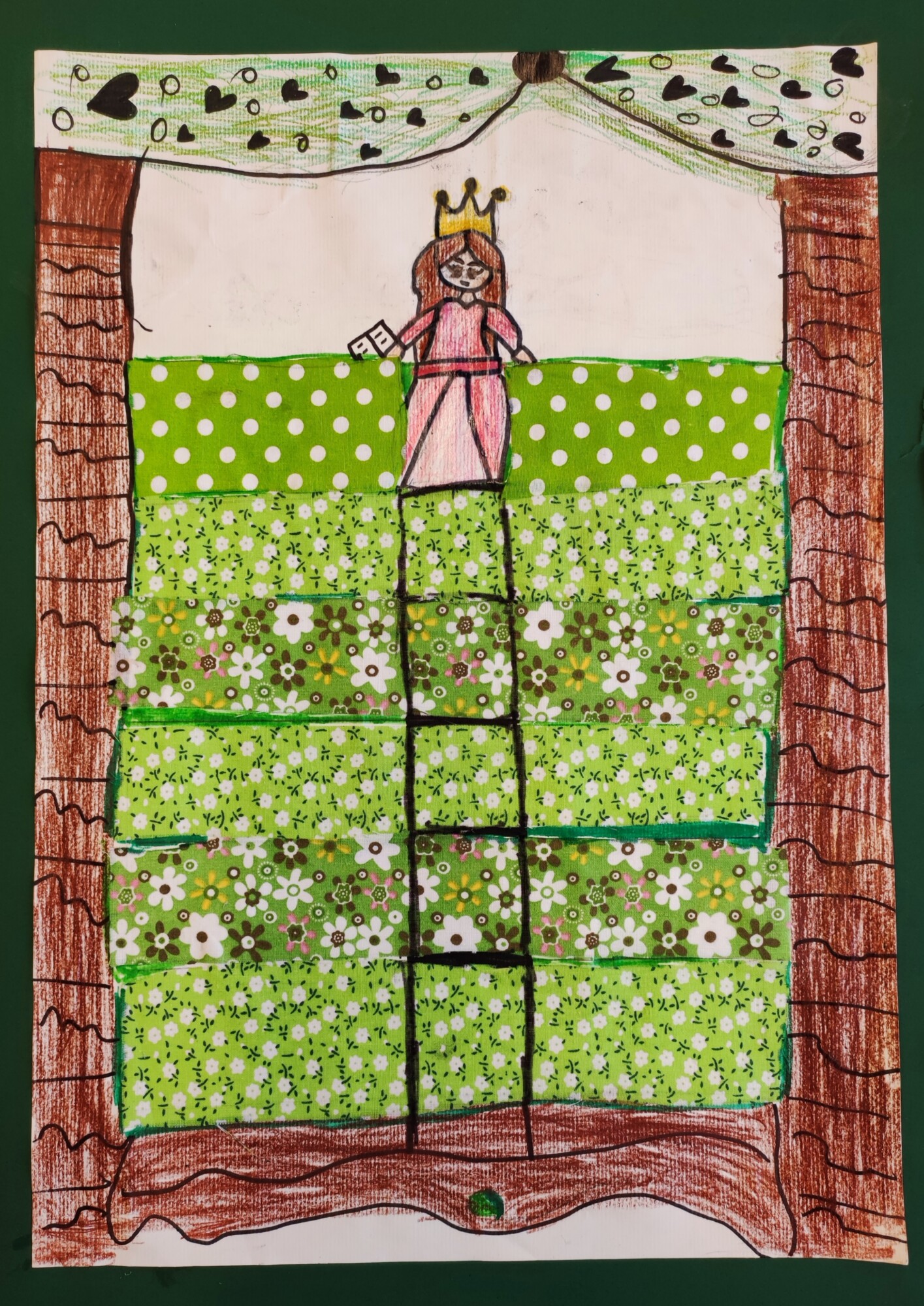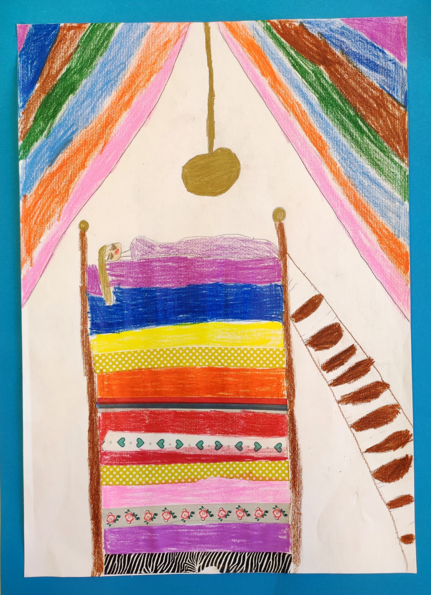 Nachdem die SchülerInnen das Märchen „Die Prinzessin auf der Erbse“ von Hans Christian Andersen gesehen und gehört hatten, gestalteten sie ein Mixed Media-Bild der „wehleidigen“ Prinzessin. Verwendet wurden Stoffe, Washi Tapes, Maschen, Geschenkbänder und vieles mehr.