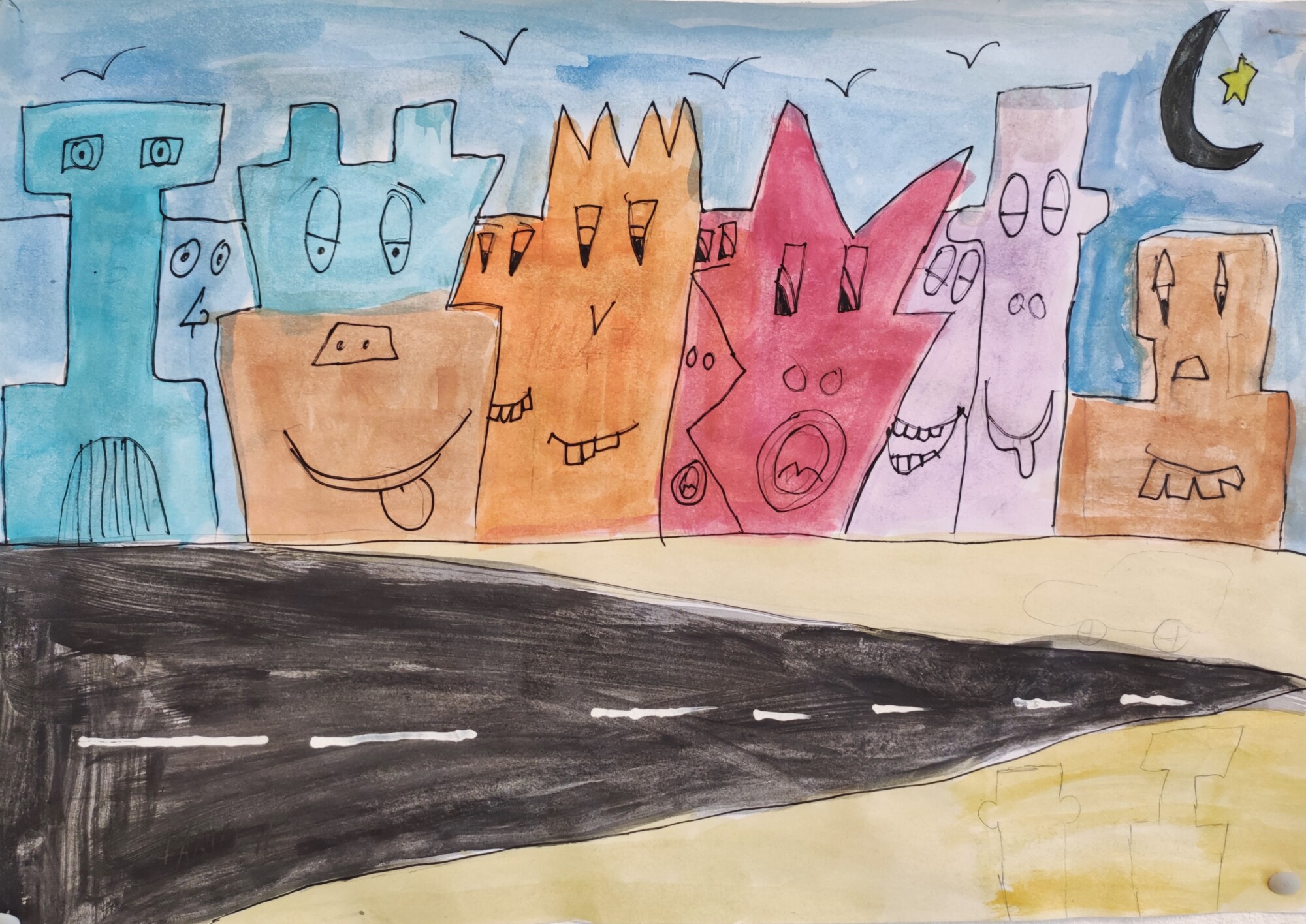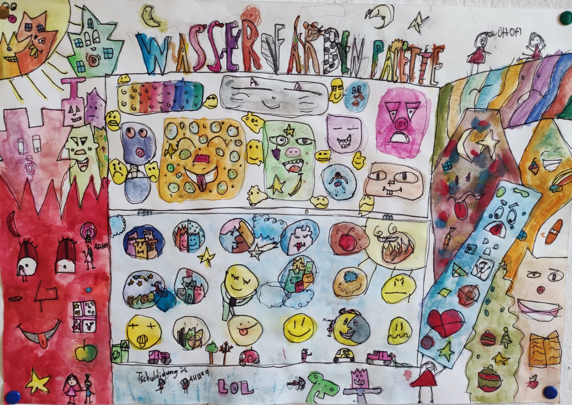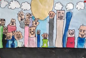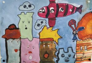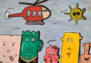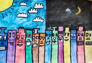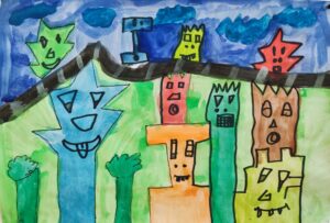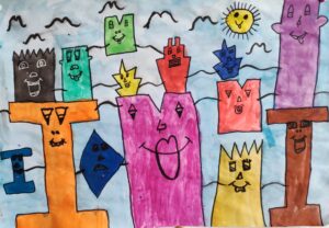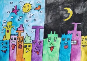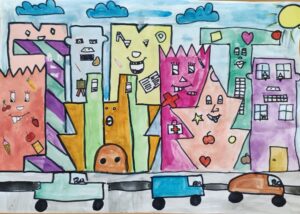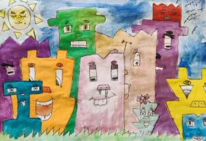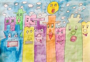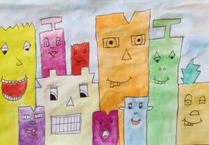In der BE- Stunde lernte die 1a den Künstler James Rizzi kennen. Mit Hilfe einer Würfelvorlage (für Hausform, Augen, Mund), gestalteten wir sodann unsere eigenen kleinen Städte im Rizzi-Stil.