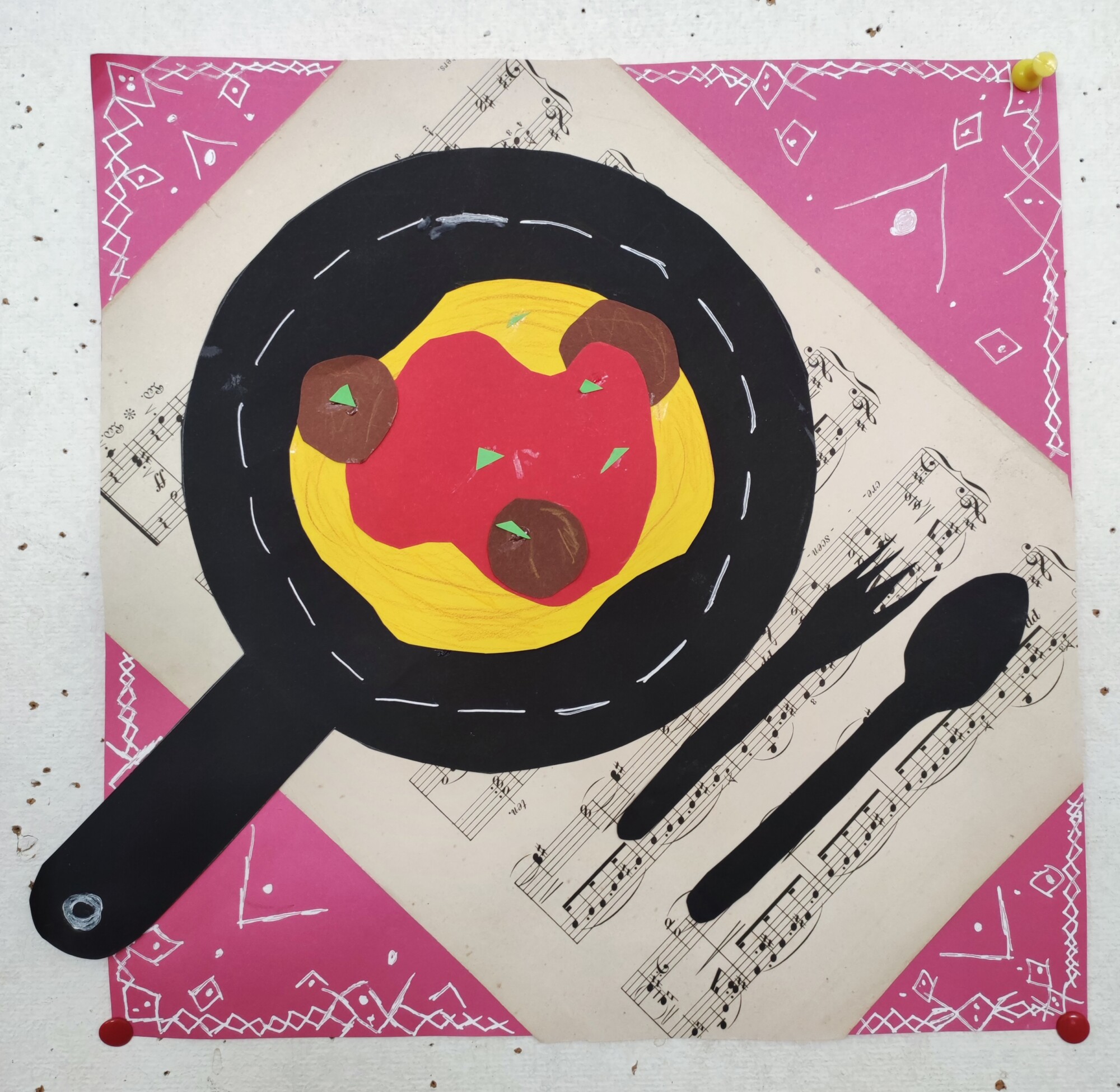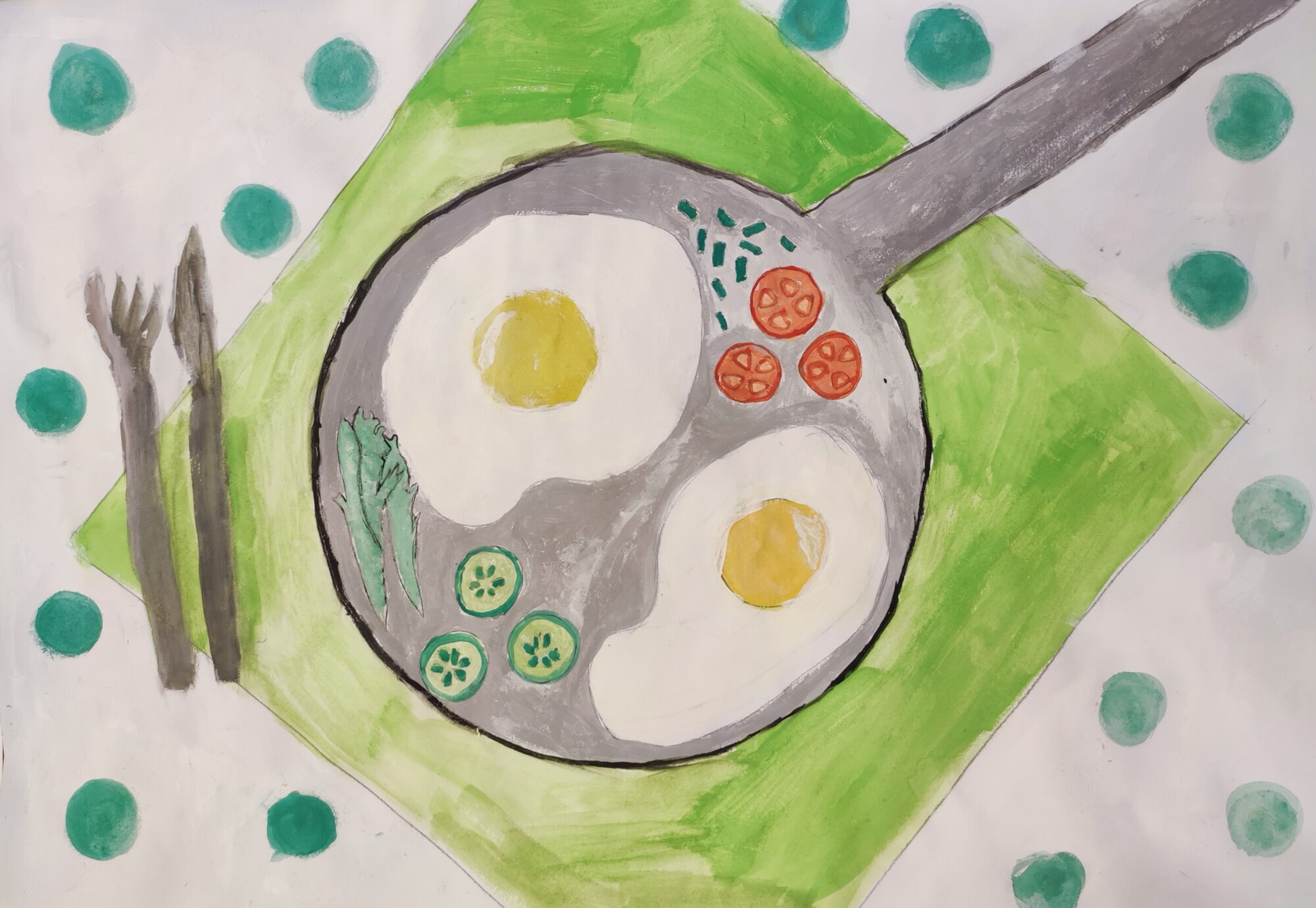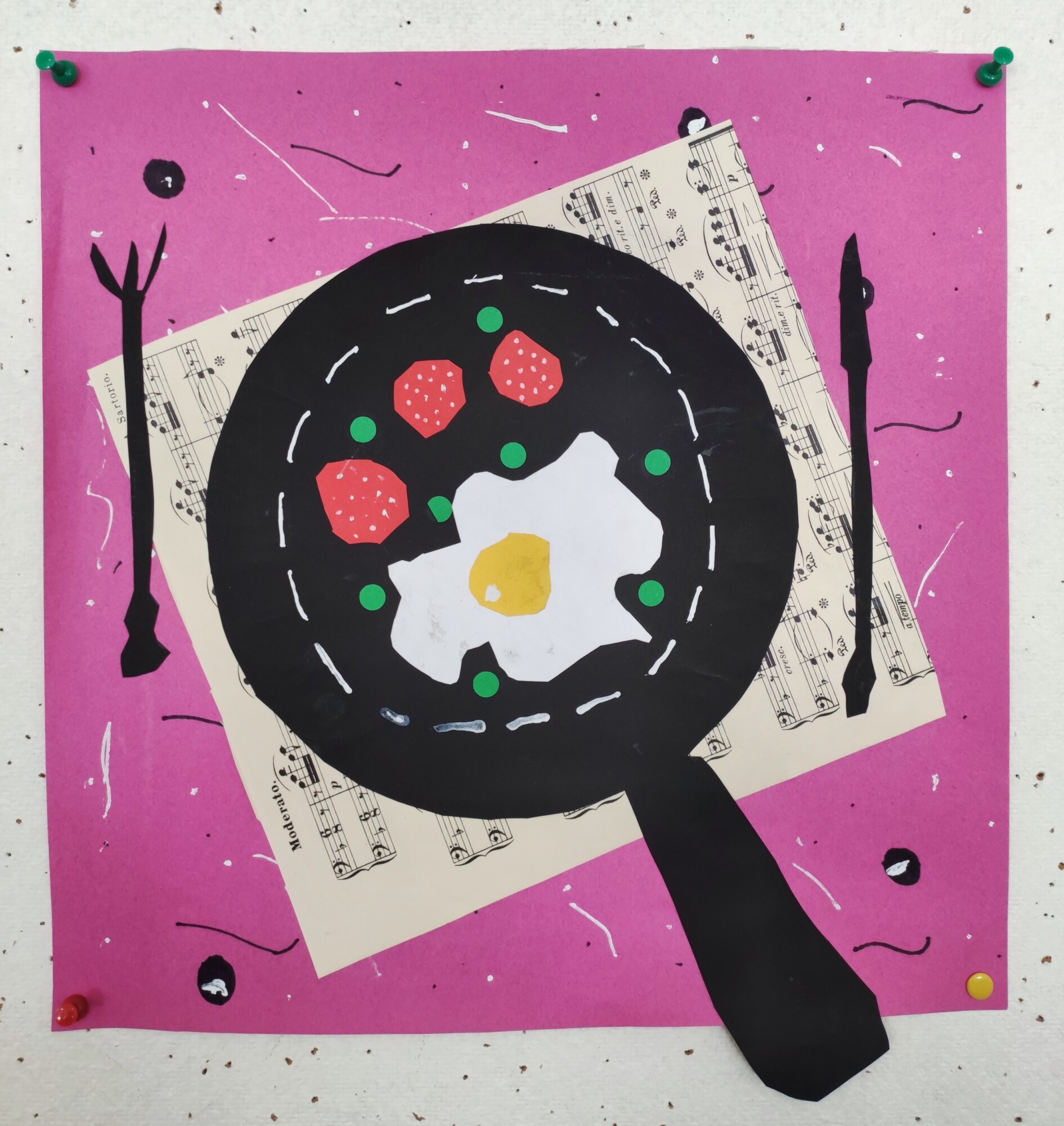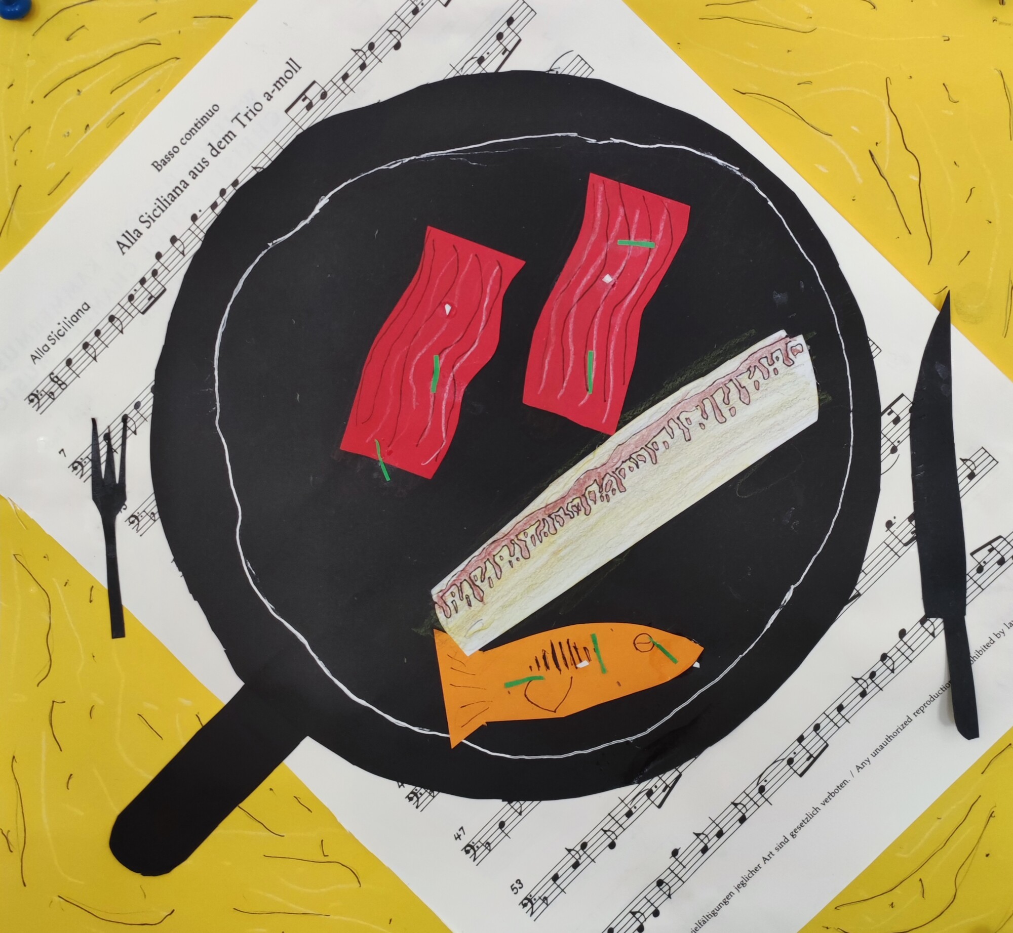 Während in der 1a Klasse mit Wasserfarben und Buntstiften gearbeitet wurde, kreierten die Künstler und Künstlerinnen der 1b ihre Mahlzeiten mit der Schere. Ob gemalt oder als Collage – beides sieht richtig lecker aus!