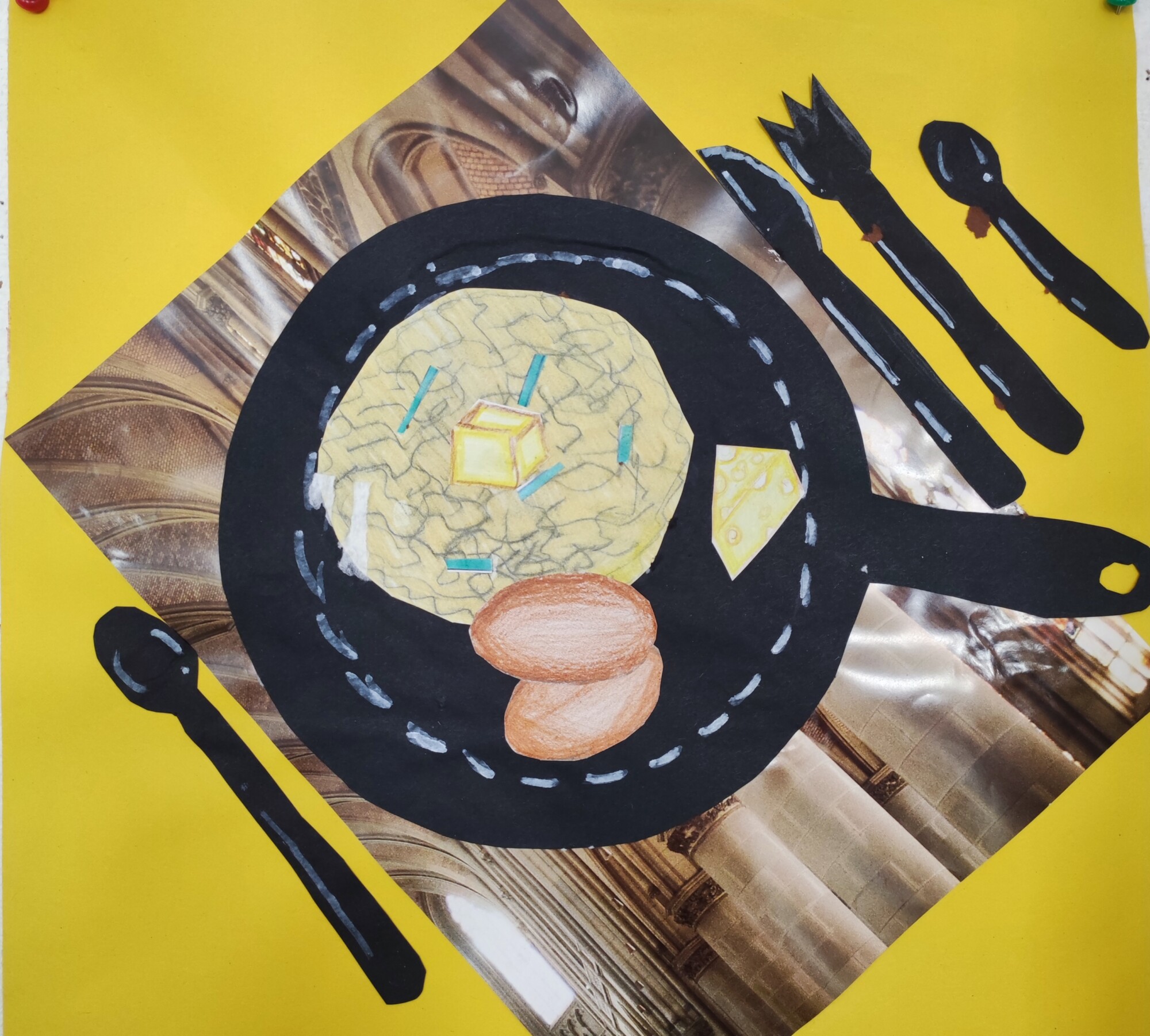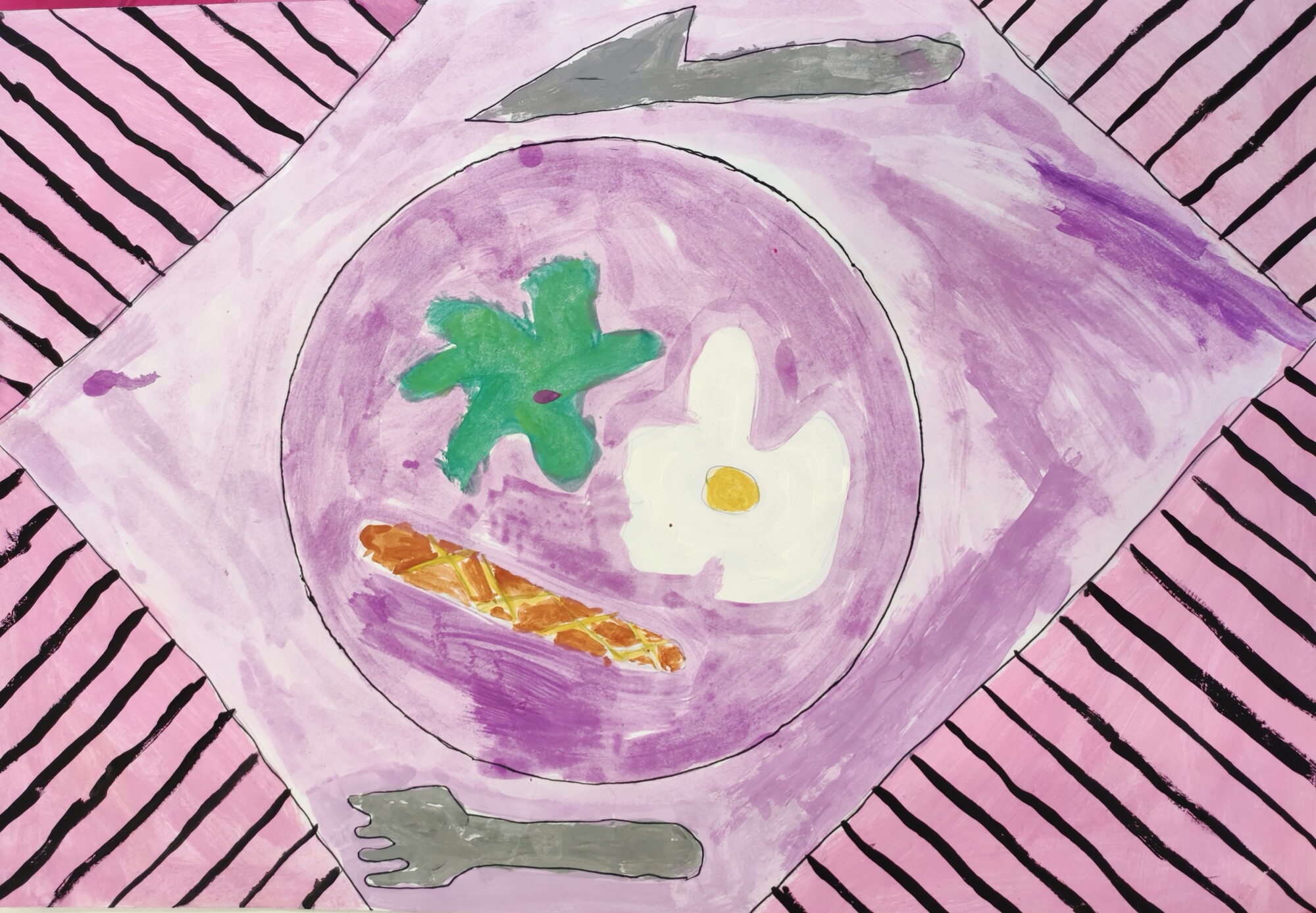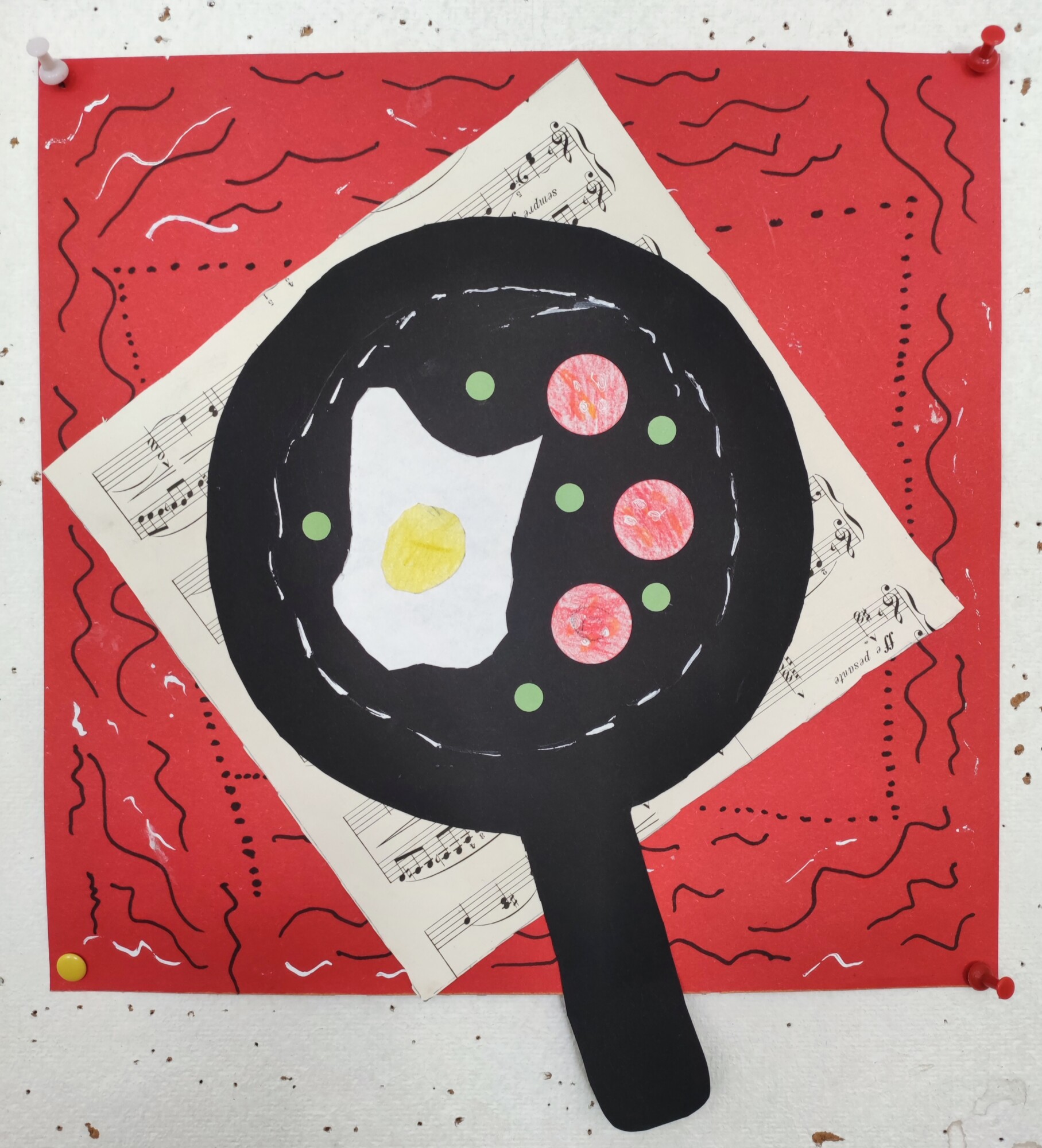 Während in der 1a Klasse mit Wasserfarben und Buntstiften gearbeitet wurde, kreierten die Künstler und Künstlerinnen der 1b ihre Mahlzeiten mit der Schere. Ob gemalt oder als Collage – beides sieht richtig lecker aus!