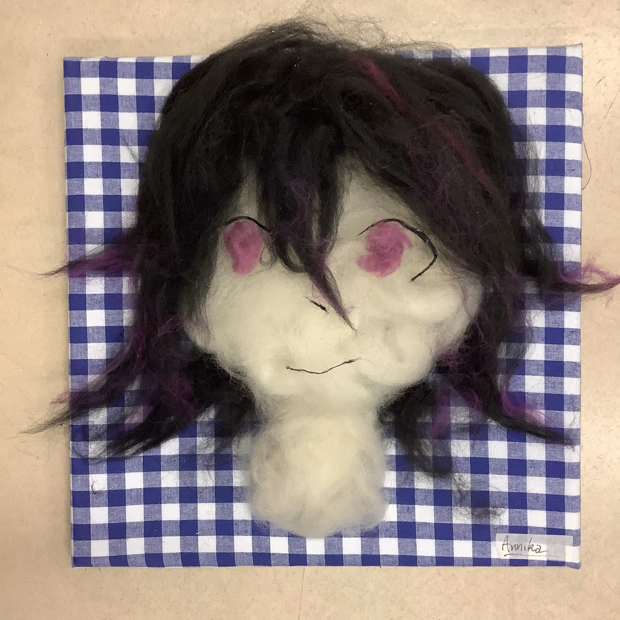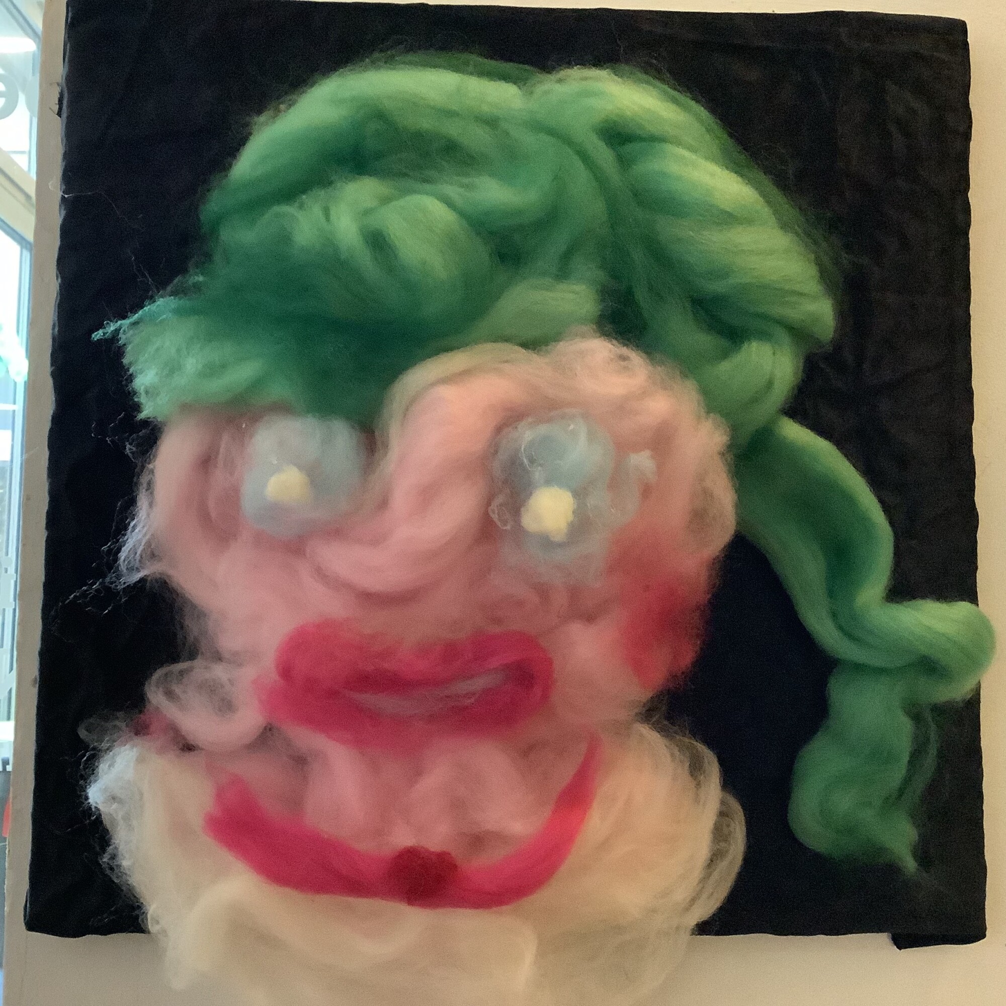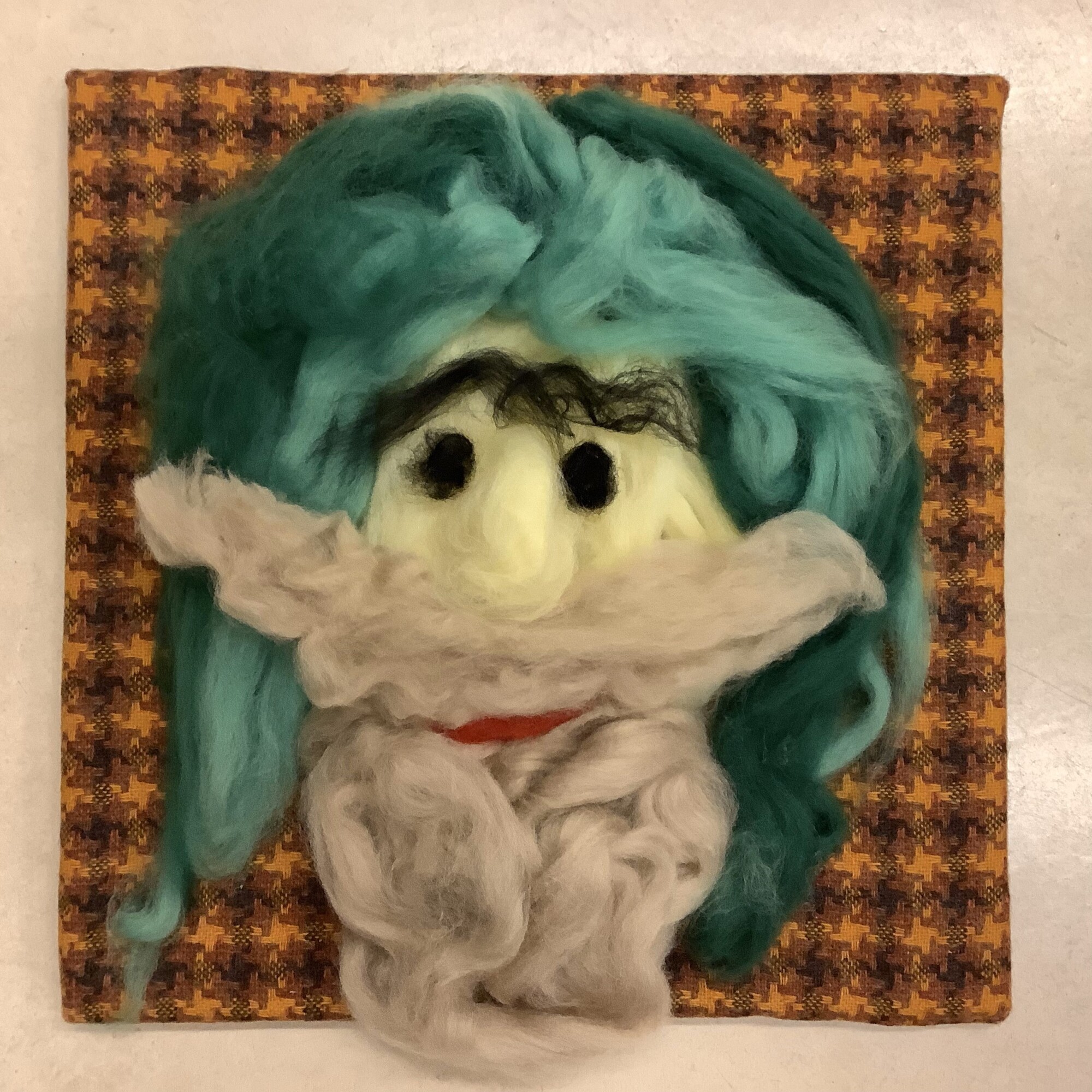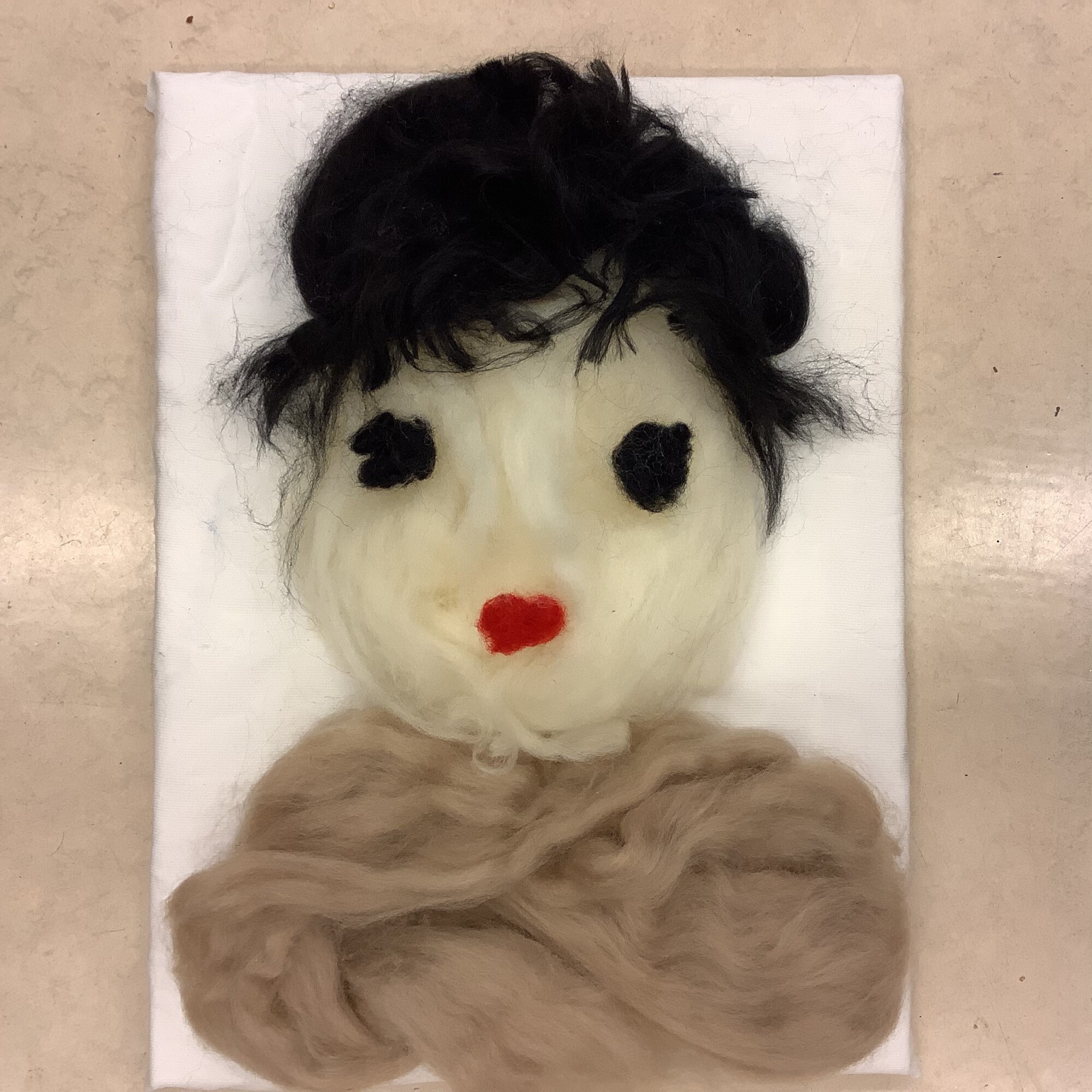 Mittels Nägel und Hammer wurde der ausgewählte Stoff auf den bereits bespannten Keilrahmen montiert. Auf dieser Oberfläche wurde der jeweilige Kopf mit Filzwolle detailliert gestaltet und geformt, sodass die Mimik und die Haare des jeweiligen Kopfes sehr gut zur Geltung kam. Sobald alle Details festlagen, wurde die Filzwolle in mehreren Schichten auf dem vorbespannten Untergrund befestigt.