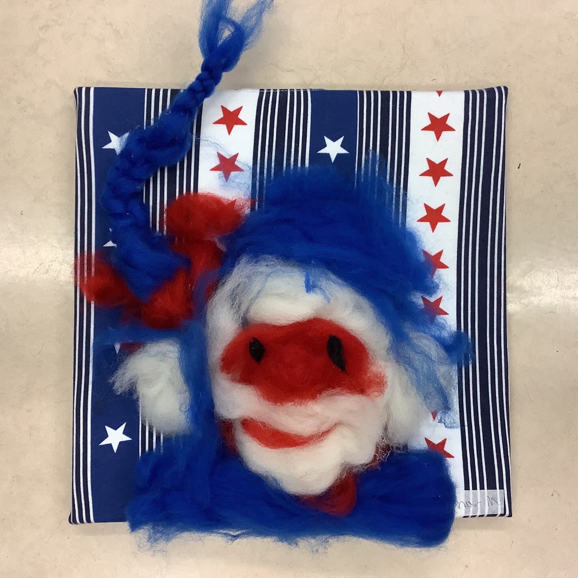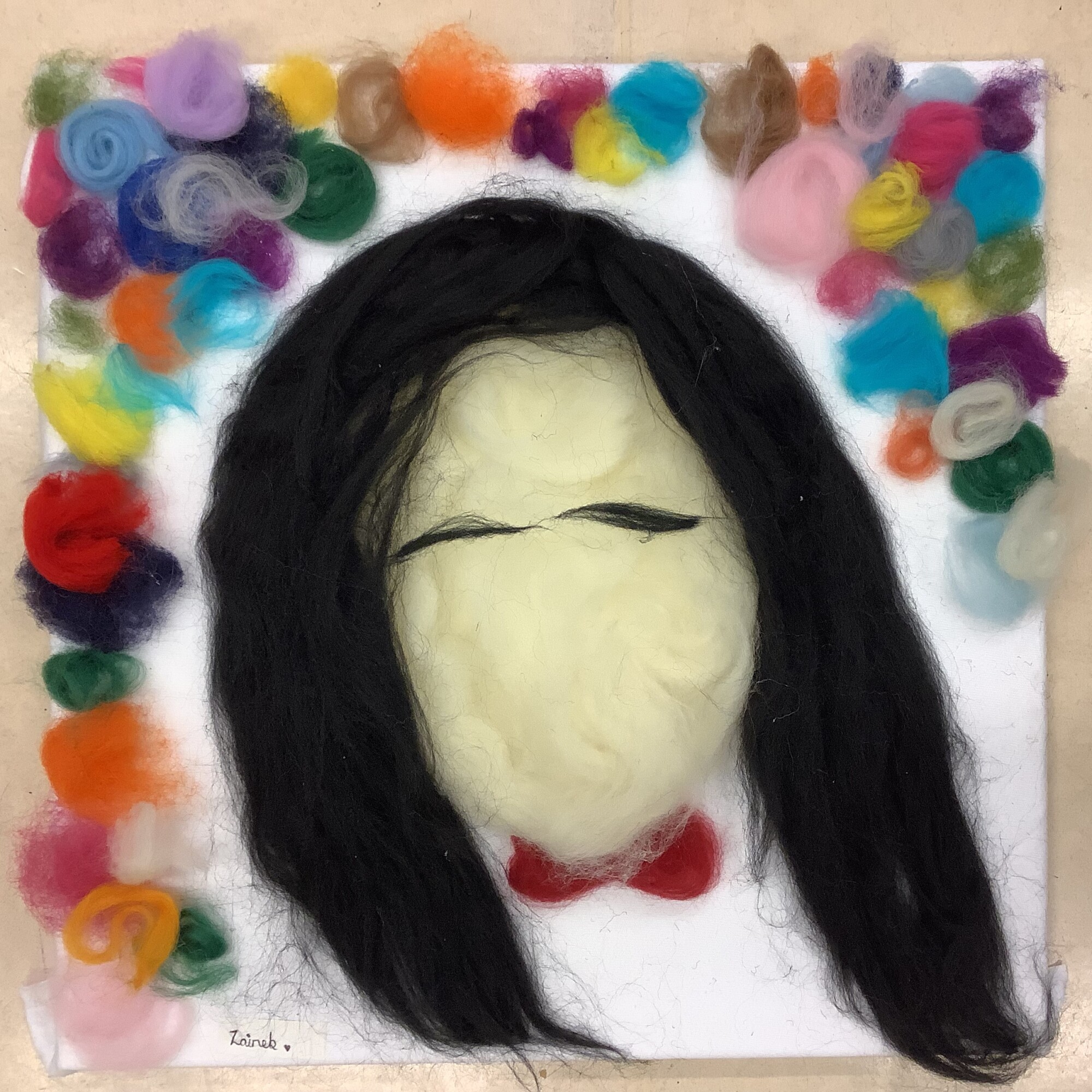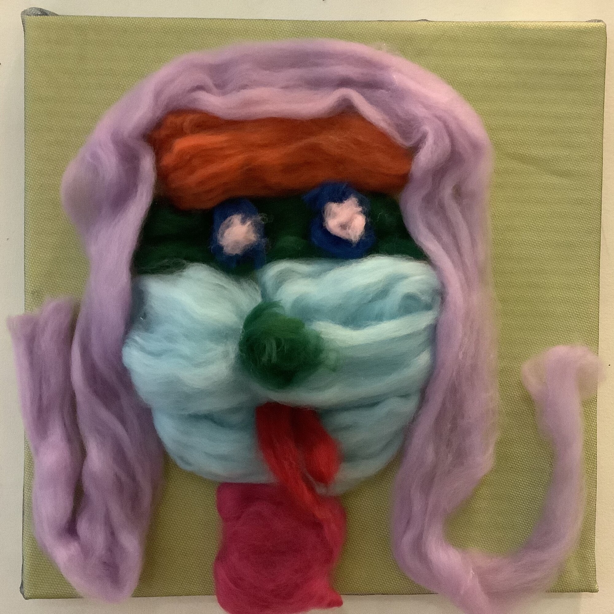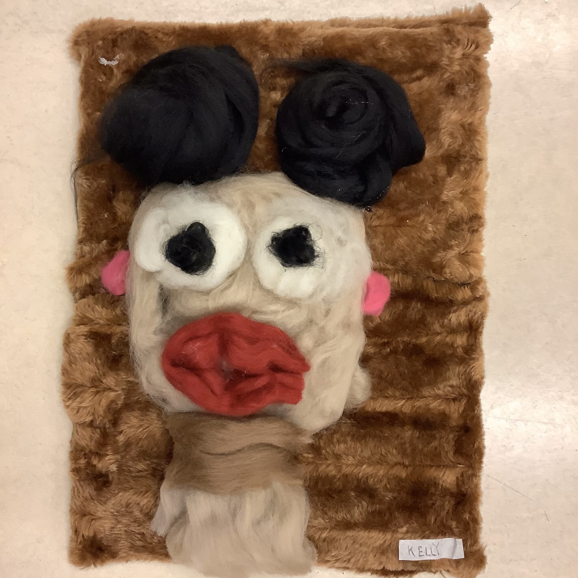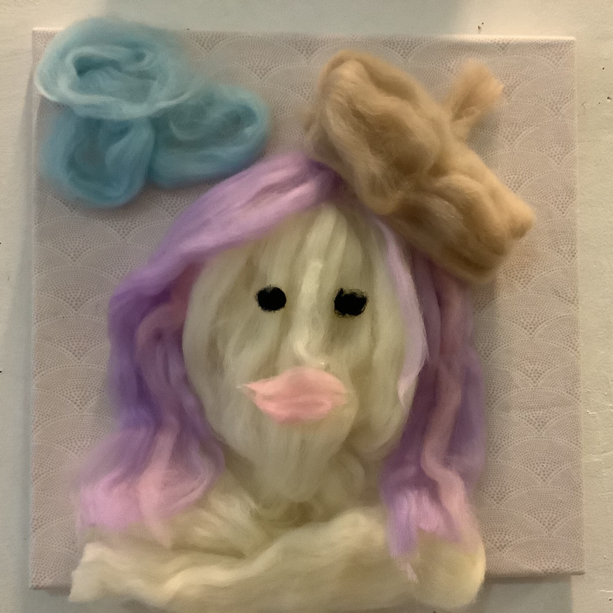Mittels Nägel und Hammer wurde der ausgewählte Stoff auf den bereits bespannten Keilrahmen montiert. Auf dieser Oberfläche wurde der jeweilige Kopf mit Filzwolle detailliert gestaltet und geformt, sodass die Mimik und die Haare des jeweiligen Kopfes sehr gut zur Geltung kam. Sobald alle Details festlagen, wurde die Filzwolle in mehreren Schichten auf dem vorbespannten Untergrund befestigt.