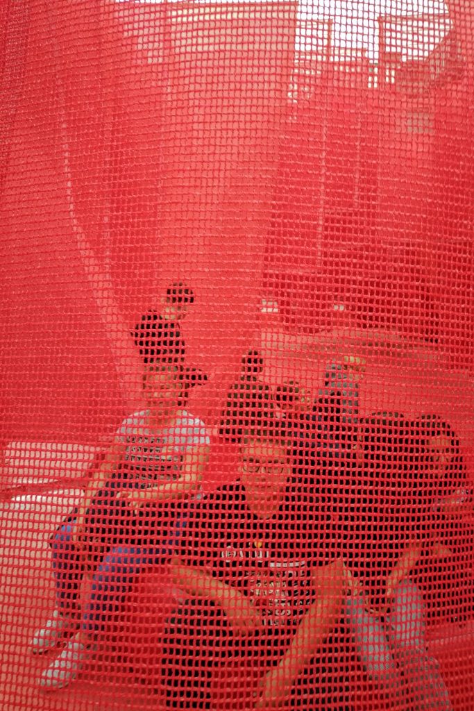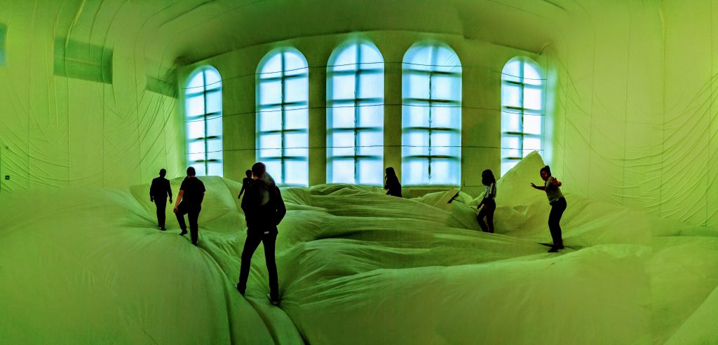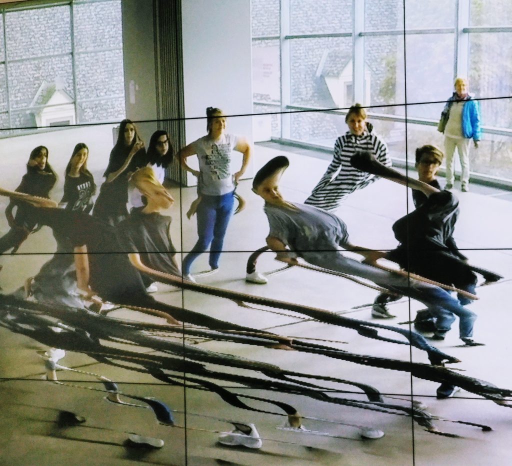 Unterschiedliche Anforderungen stellten unsere Wahrnehmung auf die Probe: So hatten wir zB. gemeinsam ein übergroßes Seil zu tragen, balancierten durch eine luftige, neongelbe Halle und schufen als Gruppe optische Täuschungs-Formationen auf einem Riesenbildschirm.