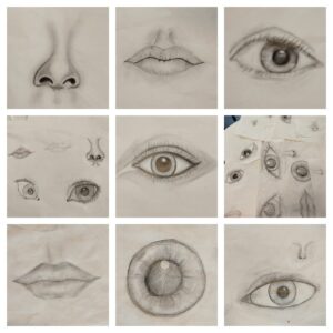 Im Fach Kreatives Gestalten der 4B dreht sich im Moment alles um das Gesicht. Unsere Studien von Augen, Mund und Nase sind in vollem Gange.